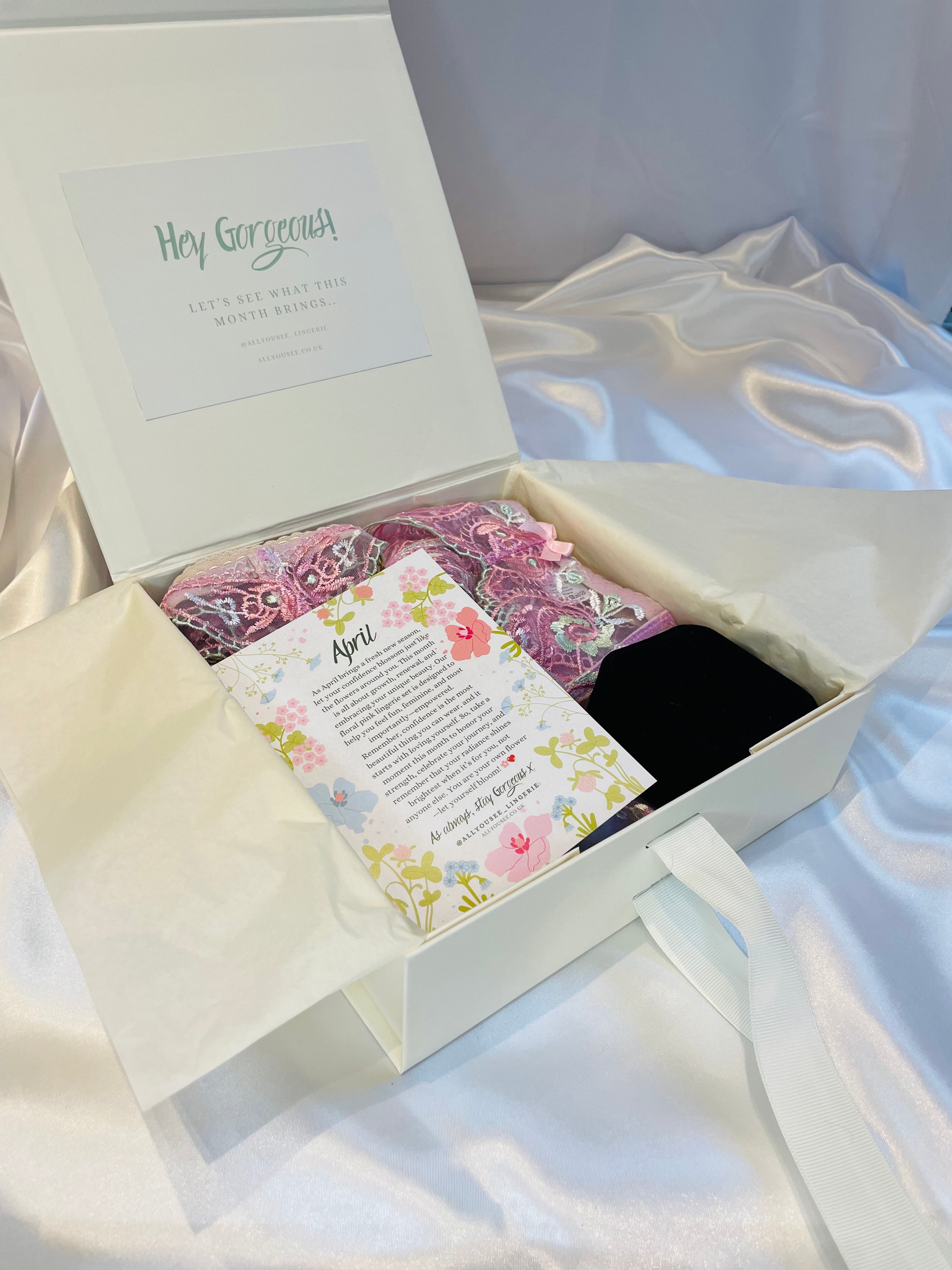 Sit back, relax and get ready for your self care box to be delivered to your door on the 15th of each month. Filled with luxury lingerie, monthly care inspiration and gorgeous gifts!